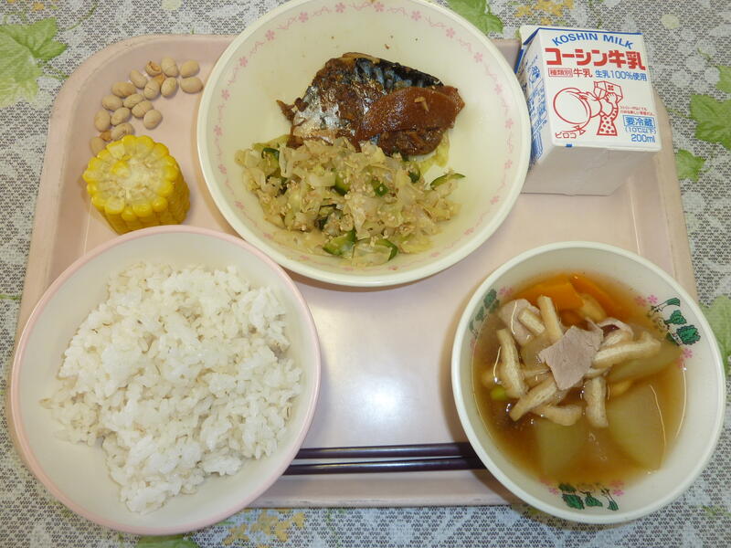 本日の献立は、ごはん、鯖の生姜煮、きゃべつときゅうりの胡麻酢和え、冬瓜汁、とうもろこし、炒り大豆、牛乳です。