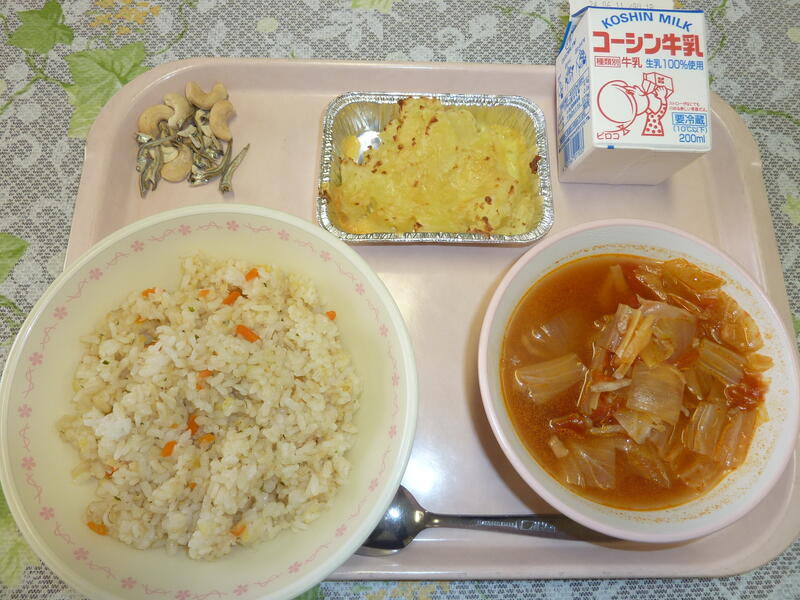 本日の献立は、ツナピラフ、ポテトのチーズ焼き、キャベツとトマトのスープ、小魚カシューナッツ、牛乳です。