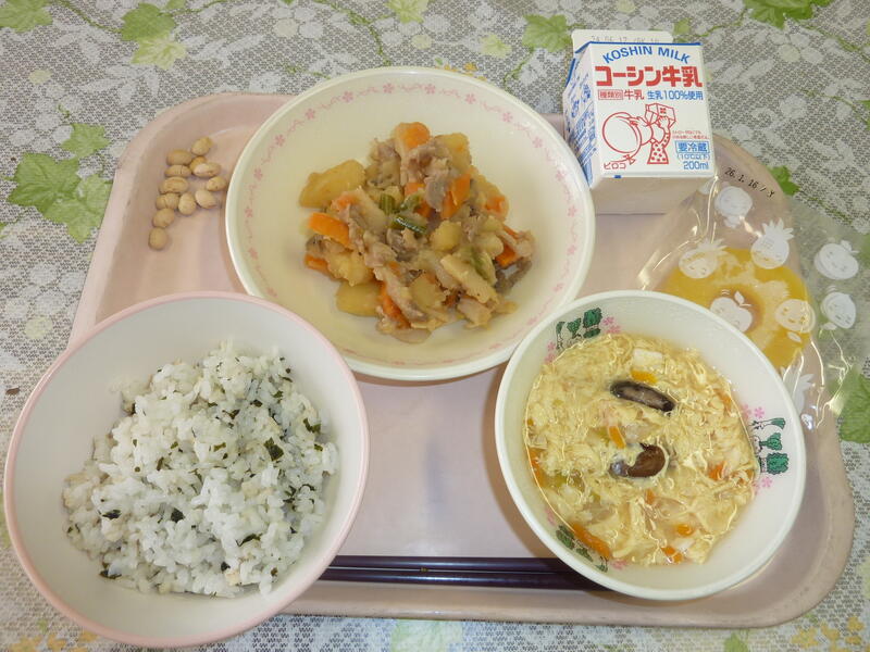 本日の献立は、わかめごはん、肉じゃが、かき玉汁、冷凍パイン、炒り大豆、牛乳です。