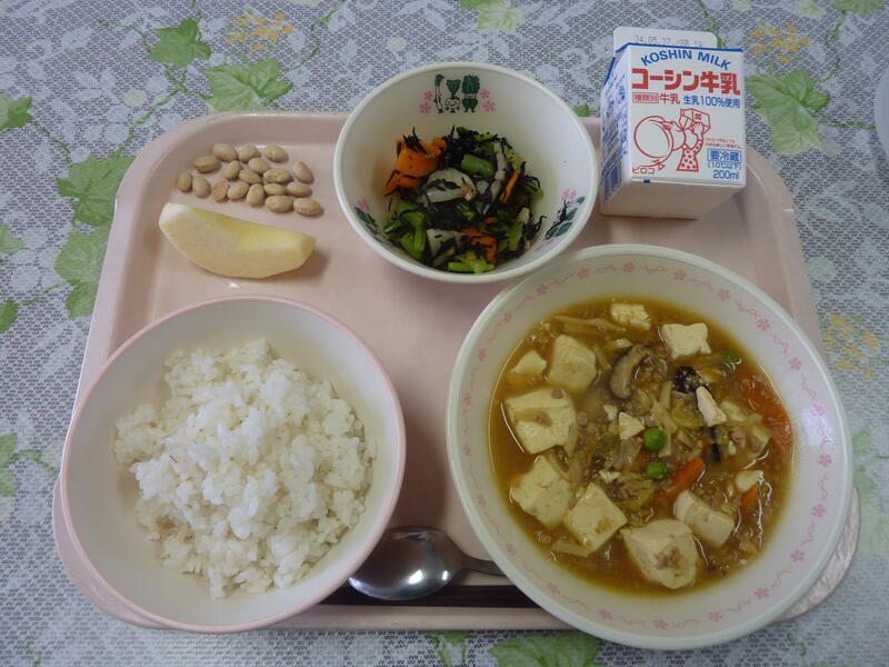 本日の献立は、ごはん、とうふのカレー煮,柏野菜とひじきのあえ物、りんご、いり大豆、牛乳です。