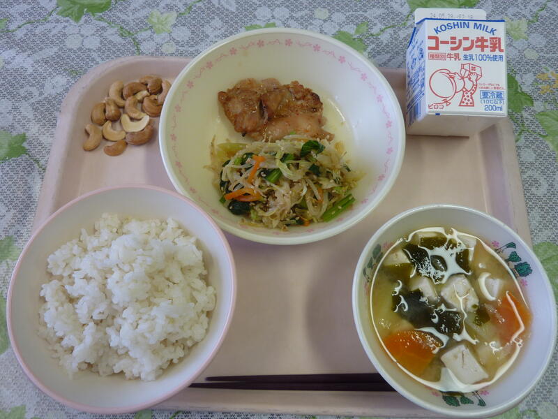 本日の献立は、ごはん、鶏肉のピリ辛焼き、ゴマ和え、じゃがいものみそ汁、カシューナッツ、牛乳です。