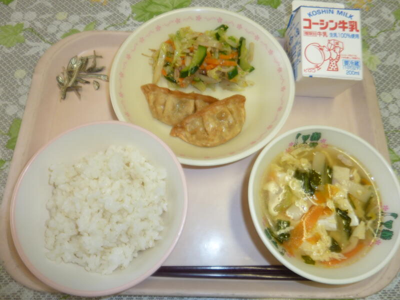本日の献立は、ごはん、揚げ餃子、ナムル、とうふの四川スープ、小魚、牛乳です。