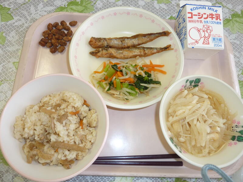 本日の献立は、とりゴボウ飯、ししゃもの唐揚げ、もやしのポン酢揚げ、大根のみそ汁、黒糖ビーンズ、牛乳です。