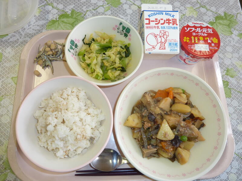 本日の献立は、ゴマごはん、新じゃがいものそぼろ煮、ピリ辛あえ、ヨーグルト、大豆小魚、牛乳です。