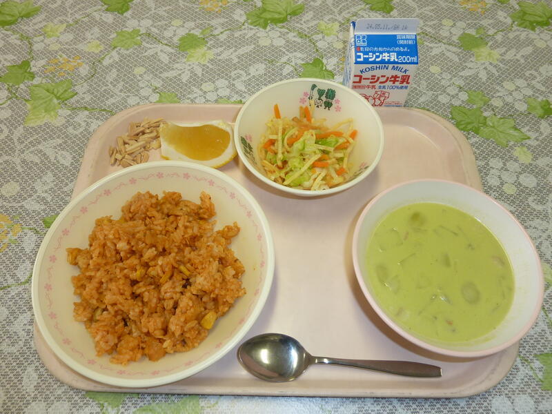 本日の献立は、チキンピラフ、グリーンピースのポタージュ、フライドポテトのサラダ、
