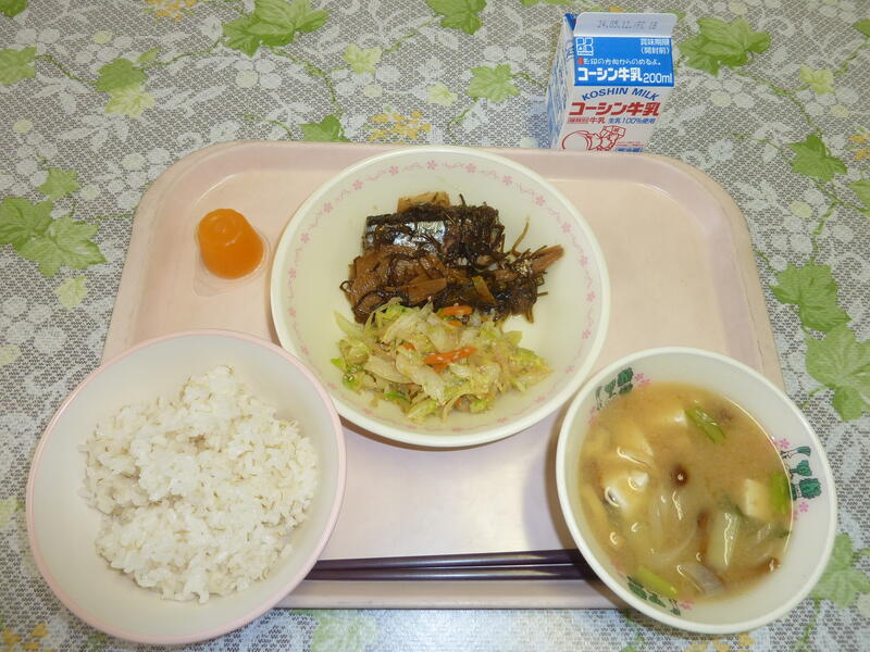 ごはん、さんまの松前煮、キャベツとたくわんのごま和え、なめこ汁、ひとくちミカンゼリー,牛乳です。