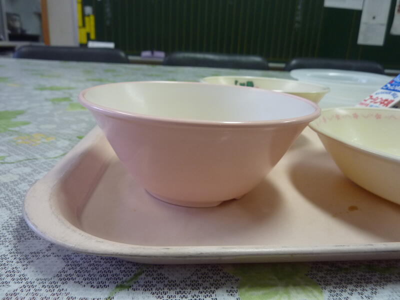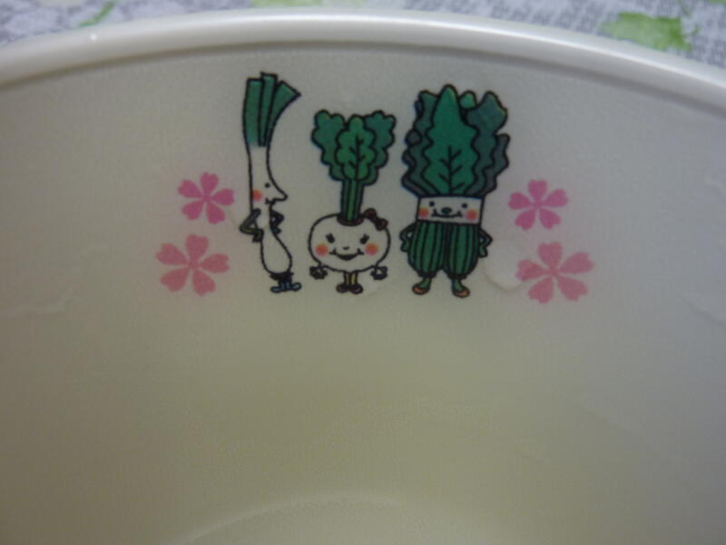 なめこ汁などの汁物・スープはこの器に盛ります。かわいいですよね。柏市の名産がプリントされているようですね。ごはんはピンクの器になります。