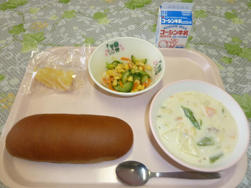 本日の献立は、黒ぱん、アスパラシチュー、コーンサラダ、冷凍りんご、牛乳です。