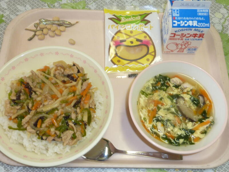 本日の献立は、チンジャオロース丼、五目中華スープ、冷凍パイン、大豆小魚、牛乳です。