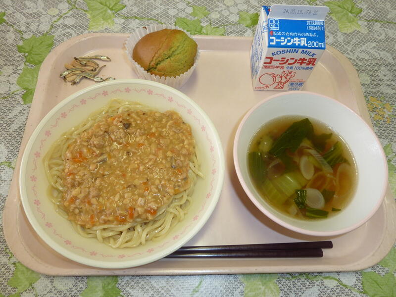 本日の献立は、牛乳、ジャージャーめん、チンゲン菜のスープ、手作り抹茶豆乳マフィン、アーモンド小魚です。