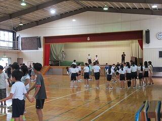 最初に全校で校歌を歌いました。指揮,伴奏も6年生児童が行いました。