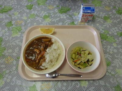 シーフードカレーライス・ひじきと青大豆のサラダ・はるか(かんきつ類)・牛乳