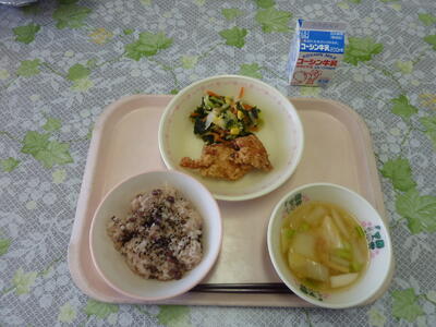 赤飯・とりの唐揚げ・わかめサラダ・柏産かぶ入りお祝いみそ汁・牛乳