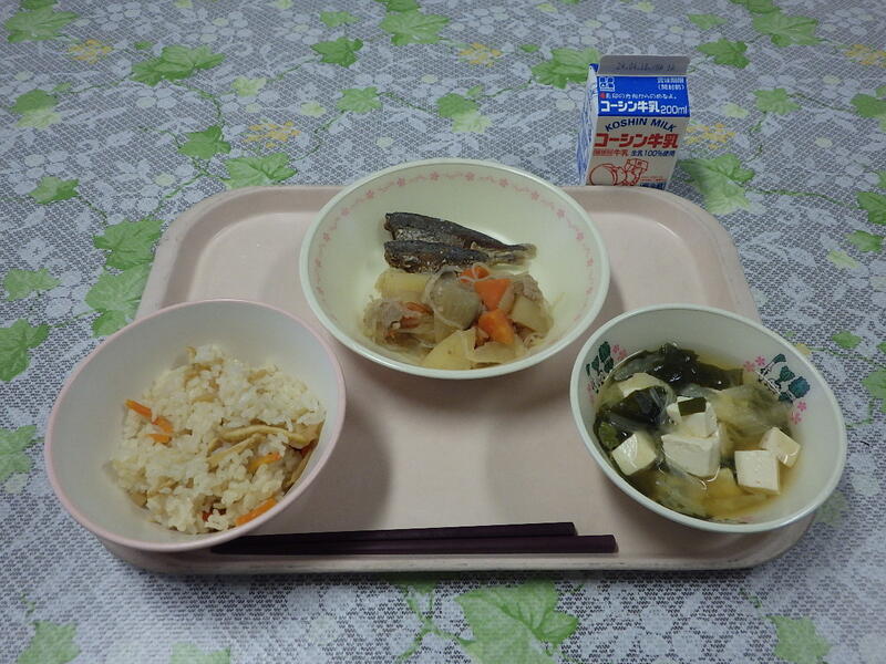 今日の献立は、たけのこごはん、小あじのから揚げ、肉じゃが、とうふとわかめのみそ汁、牛乳です。