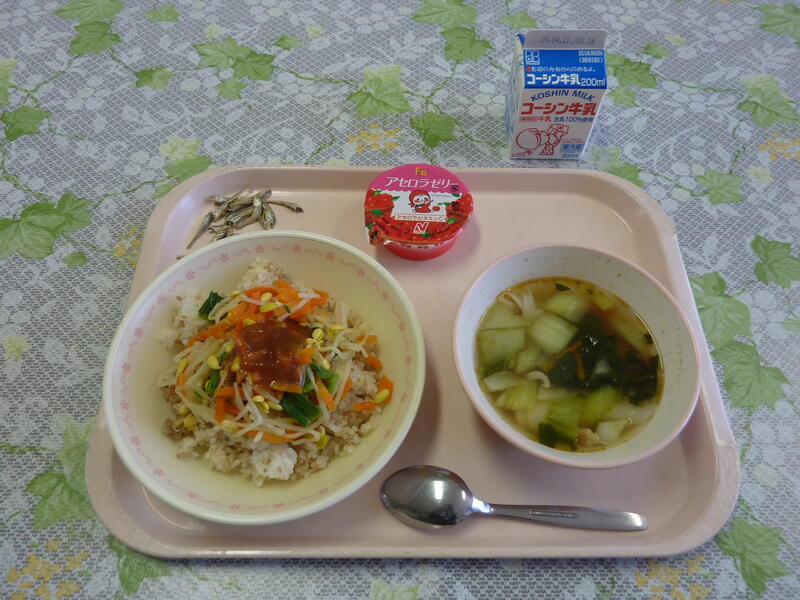 本日の献立は、ビビンバ、ワンタンスープ、アセロラゼリー、小魚です。