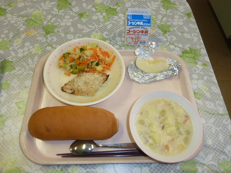 本日の献立は、コッペパン、しいらのガーリック焼き、ドレッシングサラダ、シチュー、りんごです。