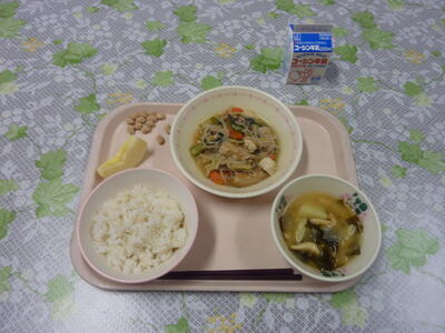 ビビンバ・卵入り春雨スープ・アセロラゼリー・大豆アーモンド・牛乳