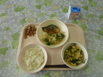 ごはん・さばのカレー焼き・菜の花あえ・ほうれん草と卵のみそ汁・カリカリ大豆・牛乳