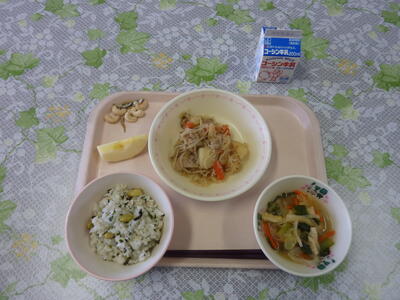 子どもたちが好きなわかめごはんは、青大豆がアクセントになっています。肉じゃがは、味が具材によくしみこんでいて優しい味に仕上がっています。大根のみそ汁は、大根だけでなくたくさんの野菜や油揚げが入っていて、まさに「食べるみそ汁」、大満足です。りんごは今日も美味しかったです。