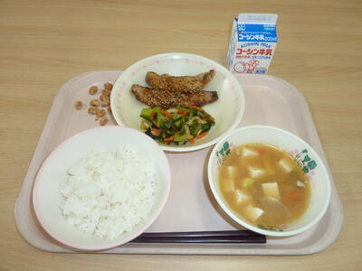 ごはん・いわしの蒲焼き・小松菜と油揚げの煮びたし・さつまいものみそ汁・きなこ大豆・牛乳
