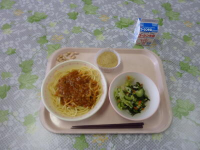 スパゲティミートソース・ハニーマスタードドレッシングサラダ・紅茶とりんごのマフィン・いり大豆・牛乳