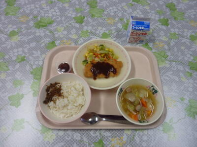 カレイのフライは衣がサクサクで、ソースとの相性も抜群です。ポトフは具だくさんです。コンソメと野菜やソーセージのうま味が一緒になって優しいお味に仕上がっています。コーンサラダは、コーンの甘みとごまの風味で、子どもたちもパクパクと食べています。ごはんに乗っているふりかけは調理員さん方の手作り。ほどよい甘辛さでごはんが進みます。