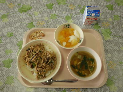チンジャオロース丼・ちんげんさいと卵のスープ・杏仁どうふ・カシューナッツ・牛乳
