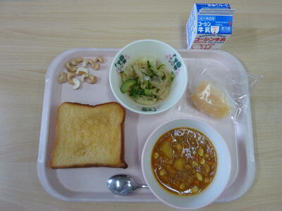 ハニーレモントースト・鶏肉と大豆のカレー煮込み・ごぼうのイタリアンサラダ・冷凍りんご・カシューナッツ・牛乳