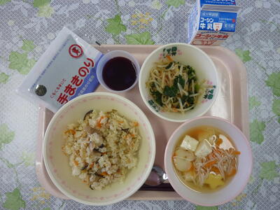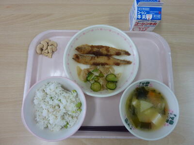 枝豆おこわ・ししゃもフライ・かぶときゅうりのごま酢和え・じゃが芋の味噌汁・メープルカシューナッツ・牛乳