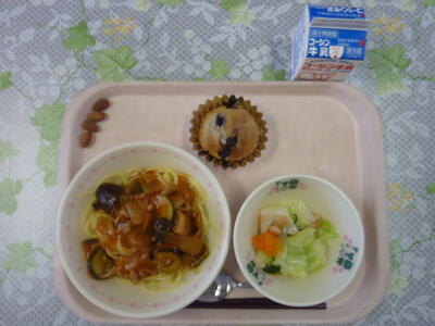 ラタトゥイユスパゲティ・いんげん豆のサラダ・ブルーベリーケーキ・粒アーモンド・牛乳