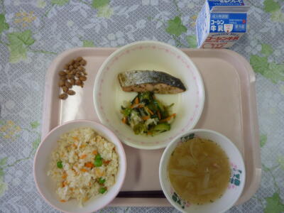 にんじんライス・鮭の香草焼き・海藻サラダ・オニオンスープ・黒糖ビーンズ・牛乳