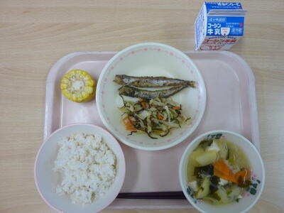 ご飯・ししゃもの磯辺揚げ・キャベツと昆布のレモン和え・じゃがいもの味噌汁・とうもろこし・牛乳