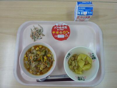 今日の給食は『味噌ラーメン』『ジャーマンポテト』でした。子ども達は楽しみにしていて、よく食べている様子でした。ジャーマンポテトはカレー粉を使い、ほんのりカレー味に仕上げました。