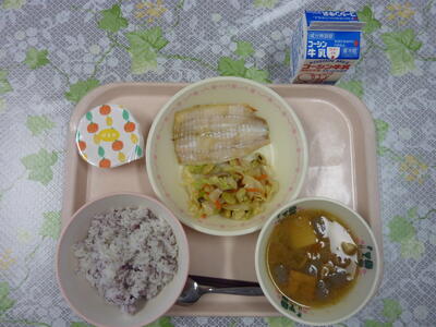 今日の給食は食物繊維をねらいとして、献立を作成しました。『青大豆としめじの和え物』には、豆類やきのこ類を使い、『さつま汁』には、さつま芋の他に根菜類のごぼうやにんじんを使い、食物繊維が多く摂取できる献立内容にしました。