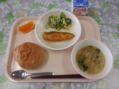 牛乳 胚芽パン 鯛のオレンジ煮 シャキシャキサラダ ABCマカロニスープ