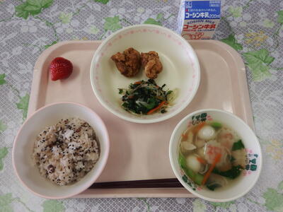 牛乳 赤飯 とりのから揚げ 磯香あえ お祝い汁 いちご