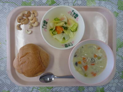 ブランコッペ・豆乳米粉シチュー・ハチミツ入りドレッシングサラダ・カシューナッツ・牛乳