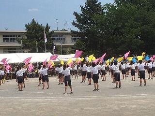 高学年表現「Unity~思いを込めて~」。フラッグをきれいになびかせながら