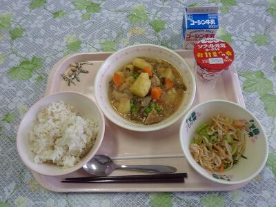 新じゃがいものそぼろ煮 投稿日時 : 2021/05/26 柏第六小学校 牛乳 ごまごはん 新じゃがいものそぼろ煮 こまつなのアーモンドあえ ヨーグルト今日の献立は,新じゃがいものそぼろ煮です。新じゃがいもは5月から7月にかけて獲れます。ほくほくとしておいしいです。しっかり食べてください。