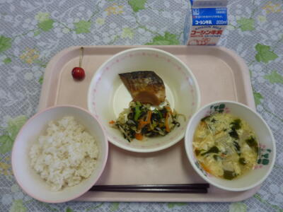 牛乳 さばの味噌煮 磯香あえ かきたま汁 さくらんぼ