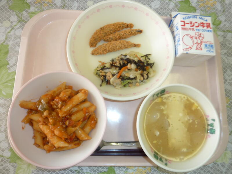 本日の献立は、ペンネアラビアータ、きびなごのカリカリフライ、ひじきと大豆サラダ、コーンスープ、牛乳です。