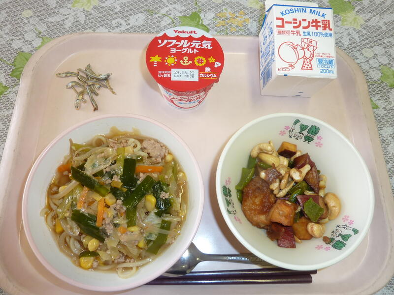 本日の献立は、みそラーメン、鶏肉とカシューナッツの揚げ煮、ヨーグルト、小魚、牛乳です。