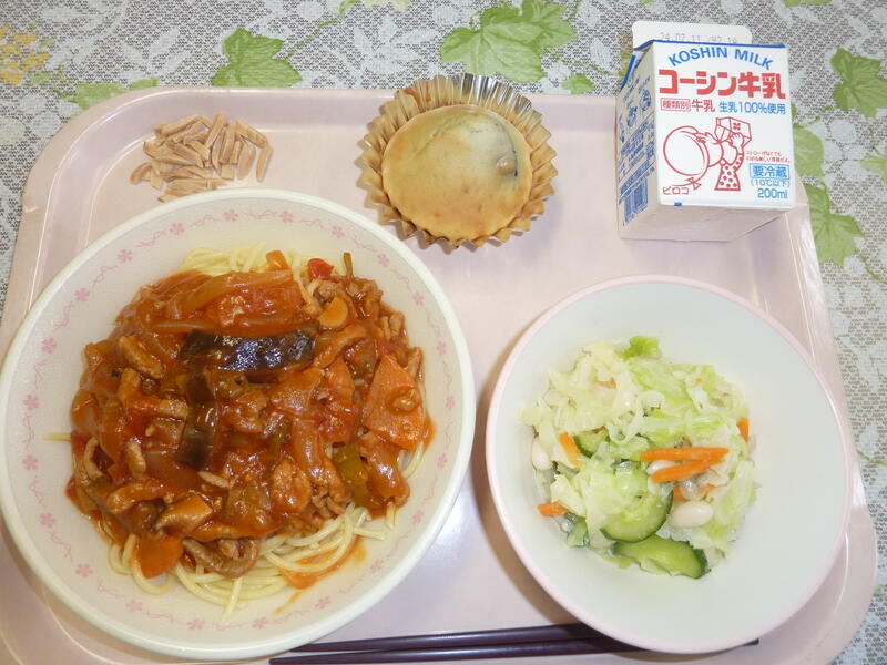 本日の献立は、ラタテゥイユスパゲッティ、いんげん豆のカラフルサラダ、ブルーベリーケーキ、アーモンド、牛乳です。