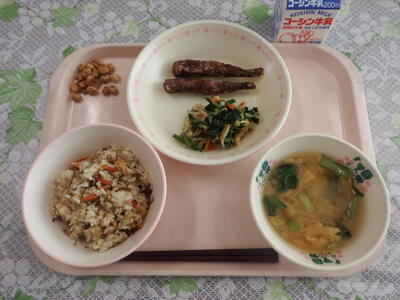 牛乳 昆布ごはん ニギスの竜田揚げ 三色あえ かきたま汁