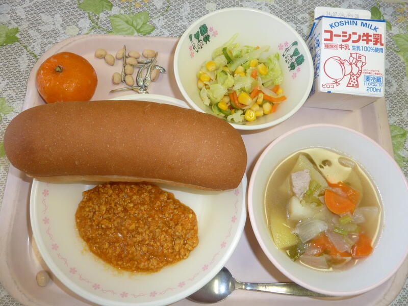 本日の献立は、カレーミートサンド、ポトフ、はちみつドレッシングサラダ、冷凍ミカン、大豆小魚、牛乳です。