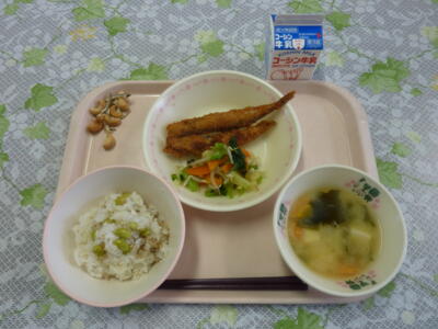 牛乳 枝豆おこわ ししゃもフライ 辛し和え じゃがいものみそ汁