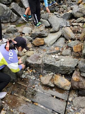 午後のオリエンテーリングは、相変わらず霧は濃く、時折小雨がぱらついていましたが、グループで協力して行うことができました。それぞれのポイントで、音真似や一句を詠むなどしてコースをまわりました。