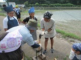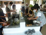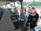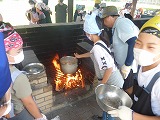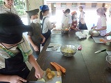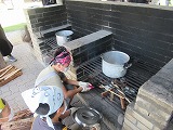 野外炊飯(カレー) かまどでのカレー作り。包丁やピーラーの使い方を気をつけたり,かまどの火や煙,暑さと闘いながらどのグループも美味しそうなカレーを作ることができました。