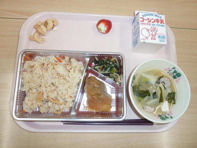 今日の給食は6年3組が家庭科の授業で考えた献立です。牛乳、炊き込みご飯、たらの香味ソース、磯香あえ、根菜のみそ汁、いちご、カシューナッツです。テーマは「旬の食べ物は何でしょうメニュー」だそうです。