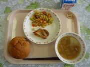 牛乳 甘納豆パン 鶏肉のマーマレード焼き きのこ入り野菜炒め オニオンスープ アーモンド